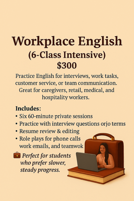 Practice English for interviews, work tasks, customer service, or team communication. Great for caregivers, retail, medical, and hospitality workers.