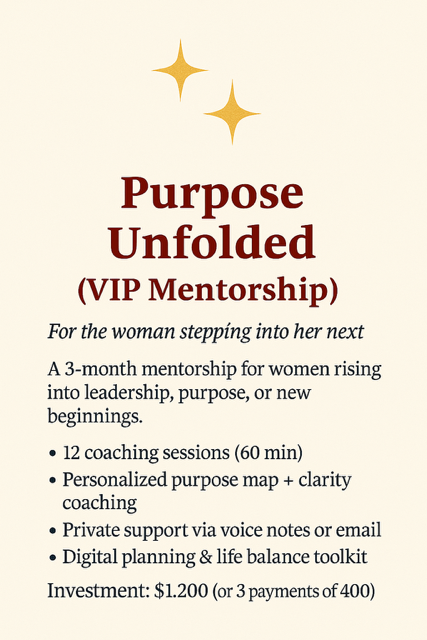 A 3-month mentorship for women rising into leadership, purpose, or new beginnings.