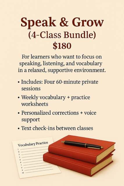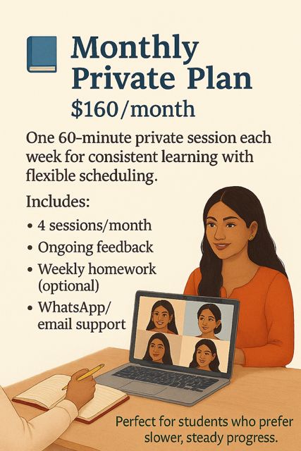 An 80-minute private class to jumpstart your learning journey. Perfect for pronunciation help, grammar guidance, or focused conversation practice.